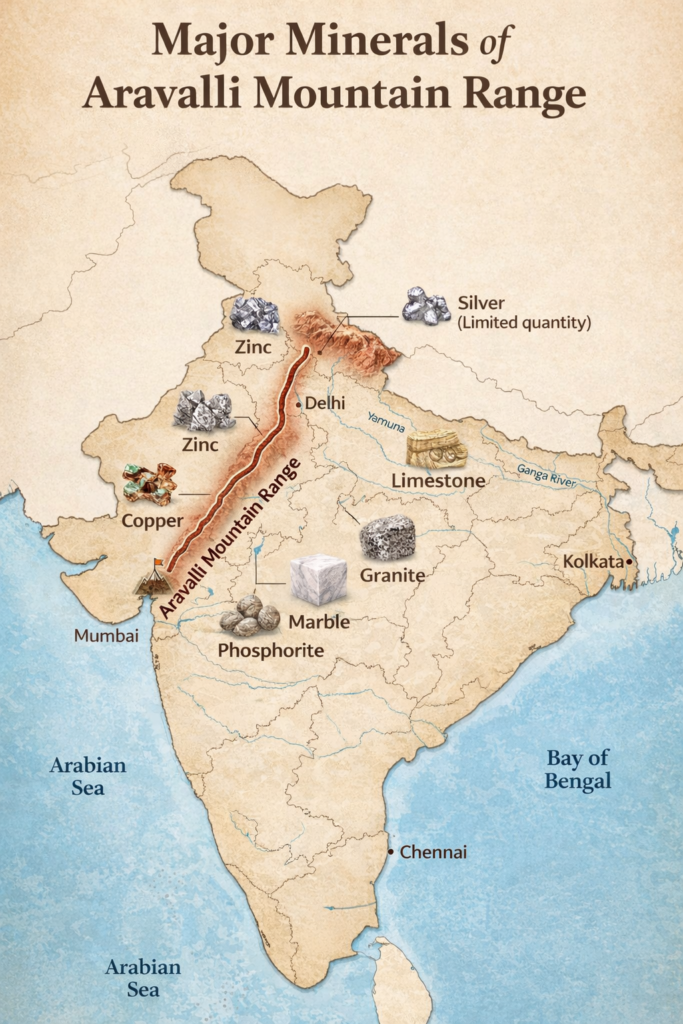 Several important rivers originate in the Aravalli range, including Banas, Sabarmati, and Luni. The range is also rich in minerals such as copper, zinc, lead, gold, silver, marble, granite, shale, limestone, and tungsten.